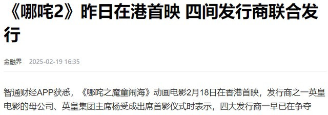 金融界2025-02-19《哪吒2》昨日在港首映 四间发行商联合发行