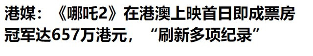 环球网2025-02-23港媒:《哪吒2》在港澳上映首日即成票房冠军达657万港元,“刷新多项纪录”
